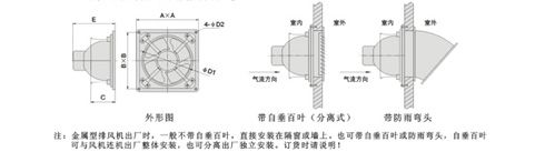 注:金属型排糖心vlog 出厂时,一般不带自百叶,直接安装在隔窗或墙上。也可带自垂百叶或防雨弯头,自垂百叶可与糖心vlog 连机出厂整体安装,也可分离出厂独立安装。订货时请说明!